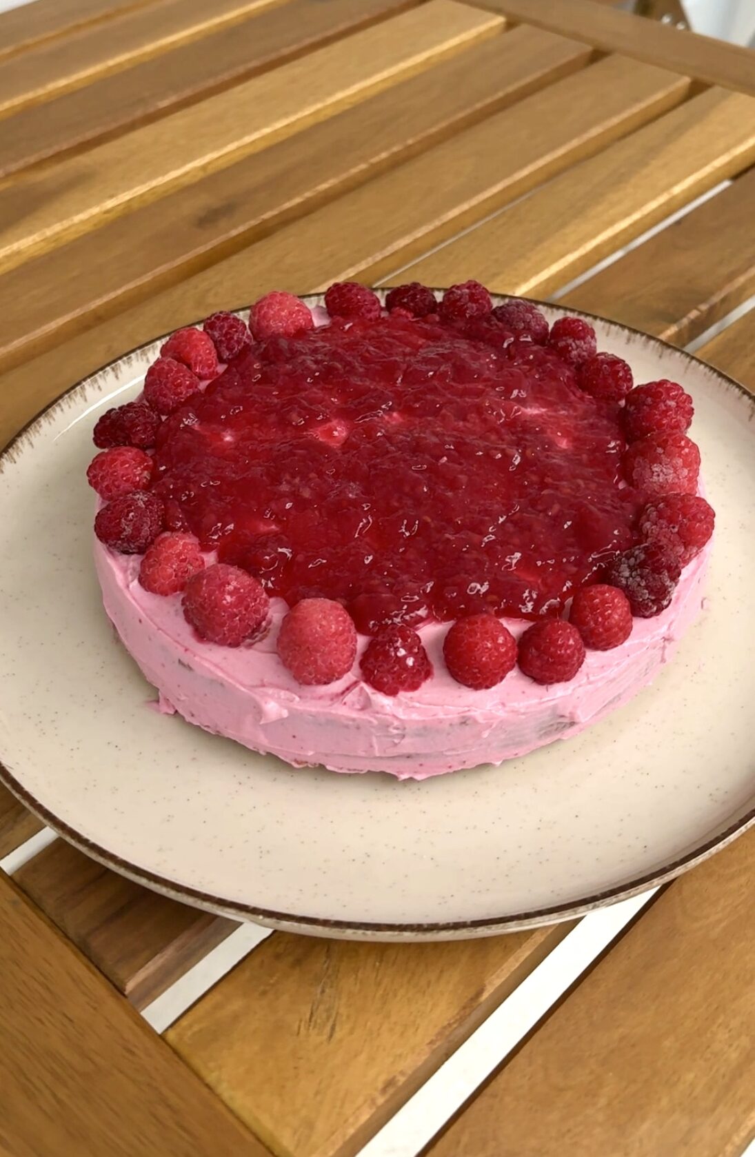 Once the cake is completely cool, remove from the pan, frost with rose cream cheese, and chill for 30 minutes before serving! I added some extra jam and raspberries!